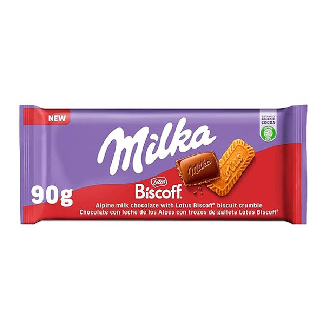 Milka Lotus Biscoff Esta tableta de Milka une el suave chocolate con leche de los Alpes con el inconfundible sabor especiado de las galletas Lotus Biscoff. Una combinación crujiente y cremosa que deleita los sentidos y es perfecta para compartir. Formato: tableta de 90 g